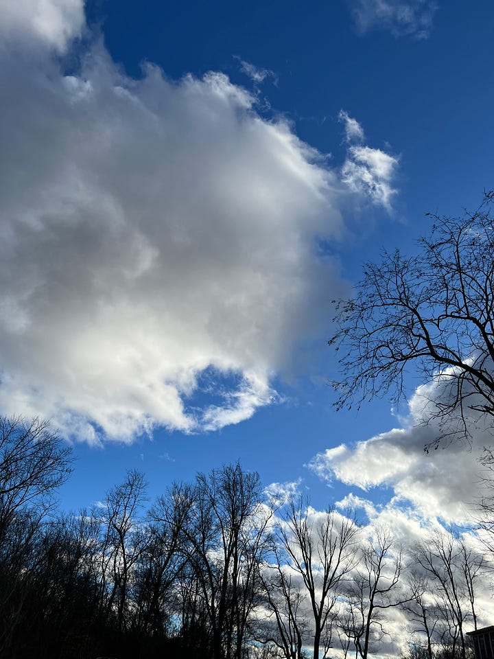 Before jumping into this week’s post, I want to share a little background. I begin writing my essays a week ahead of time. I’m neither fast nor prolific so my process is to write, think, rewrite, step away, edit, etc. This week you might see some commonality between my post and the 2/18 post from Rob Moir at Clam Chowdah Narratives. I’ll admit to a little panic when I saw Rob’s terrific conversation about – clouds! Apparently, we were both struck by the same recently published scientific research. I reached out to Rob, and he graciously told me that it was fine to continue with my reflection on the same theme. If you read them both, you’ll see that we start from similar places and then head in different directions. I hope that you will follow Rob at Clam Chowdah Narratives and read his latest post for a beautifully written and more scientifically based take than I am able to offer.1 With that said, off we go into the clouds.